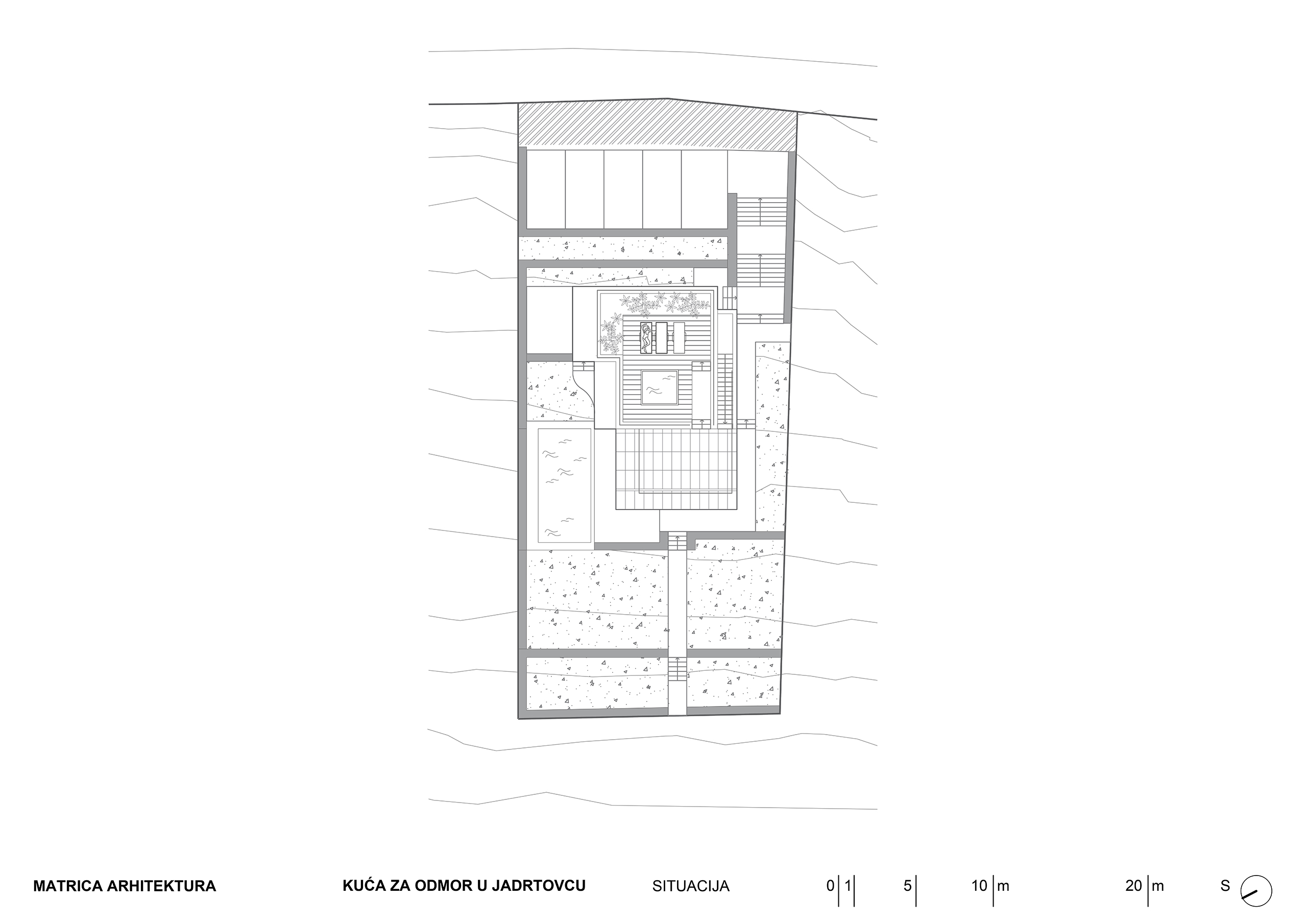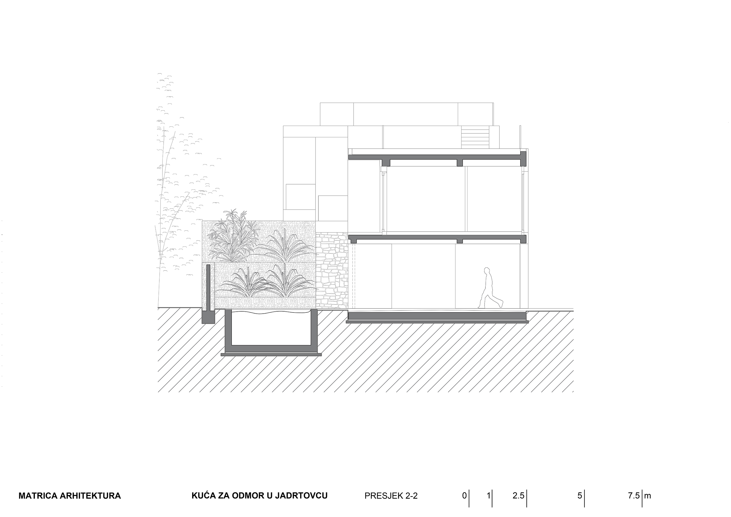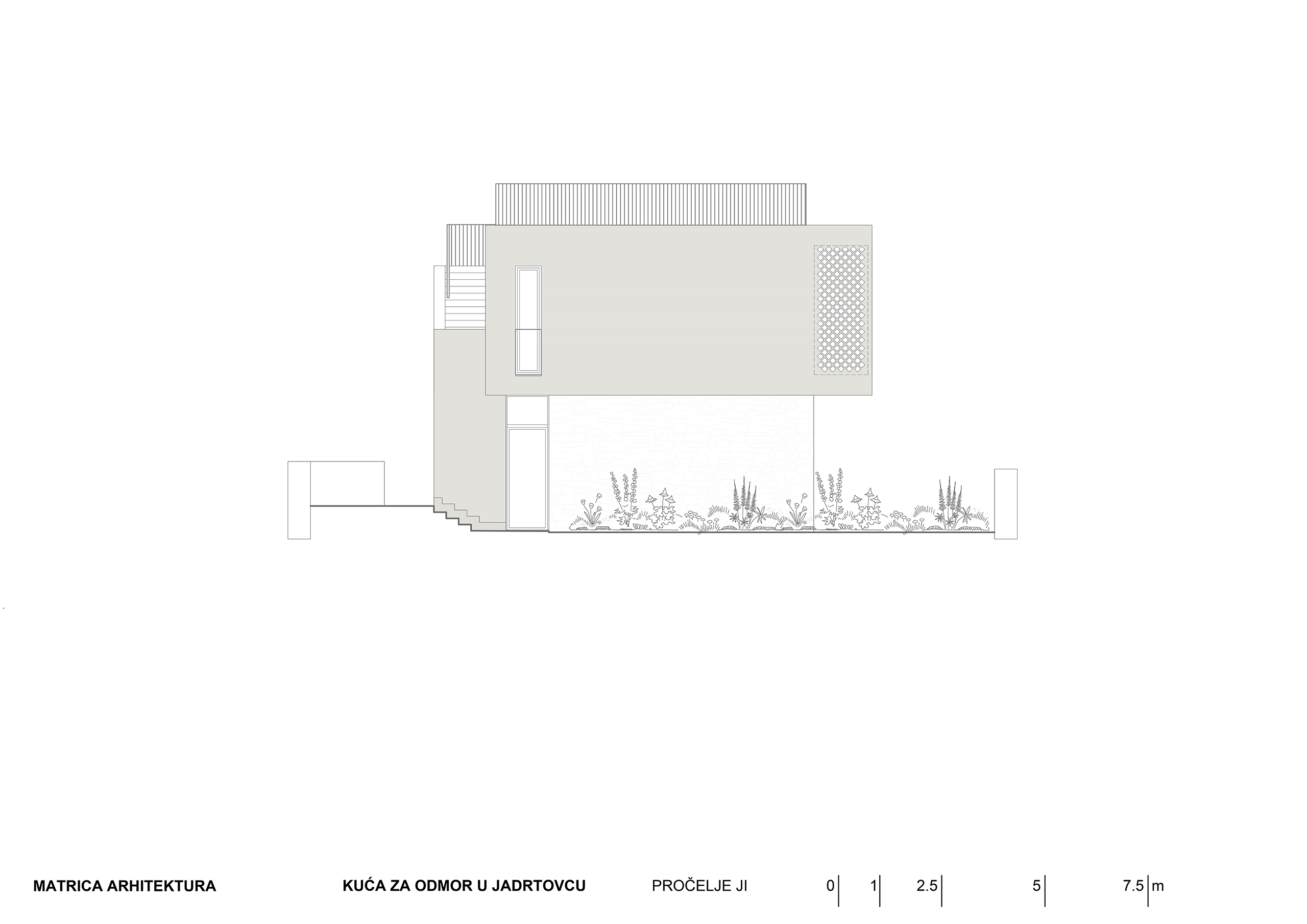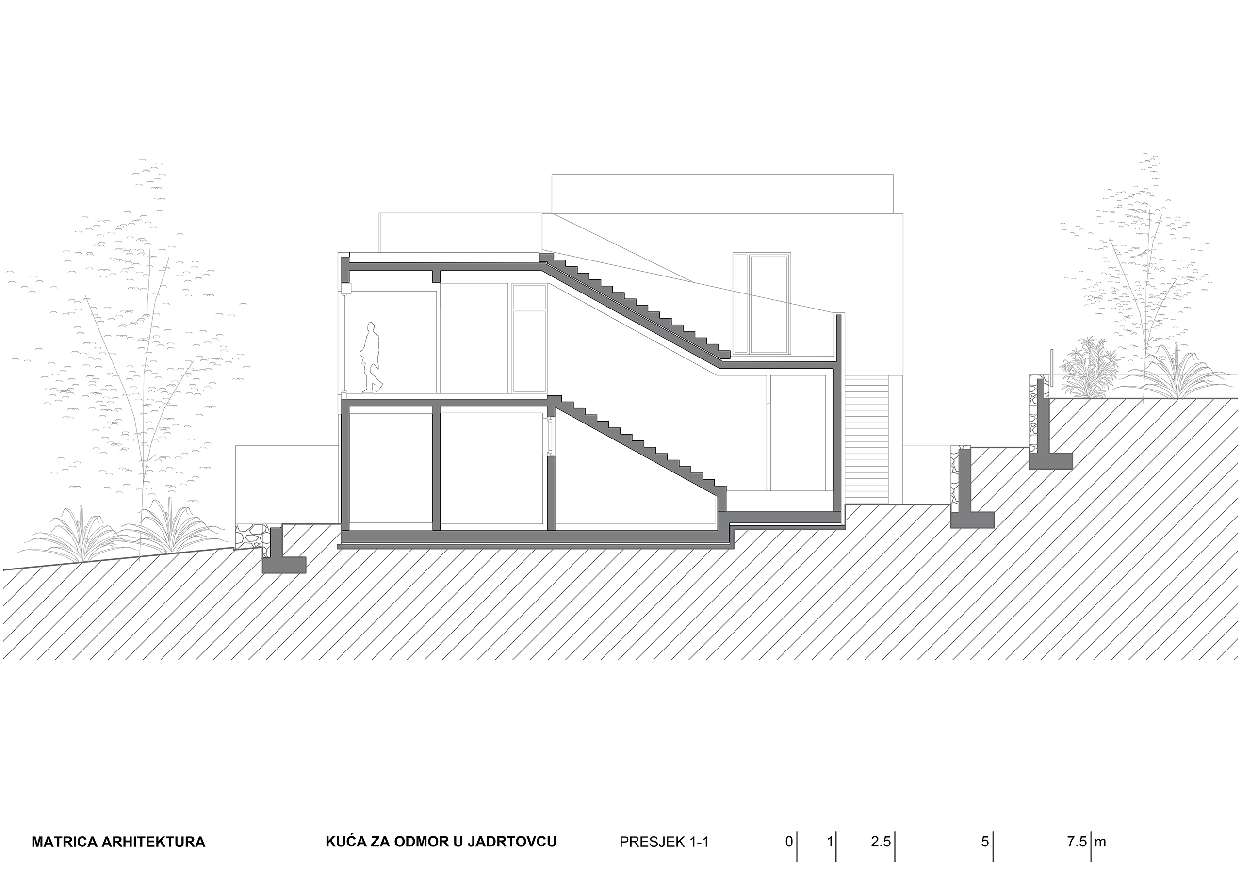 Kuća za odmor u mirnoj uvali Jadrtovca prilagođava se padu terena tako da se iz svakog dijela prizemlja izlazi na terase koje su u razini terena. Osim izmicanja po visini volumen se izmiče i tlocrtno, tako da se svaka prostorna cjelina kuće otvara prema moru a štiti od sunca, što je poželjna karakteristika za kuću koja služi uglavnom za ljetni odmor.