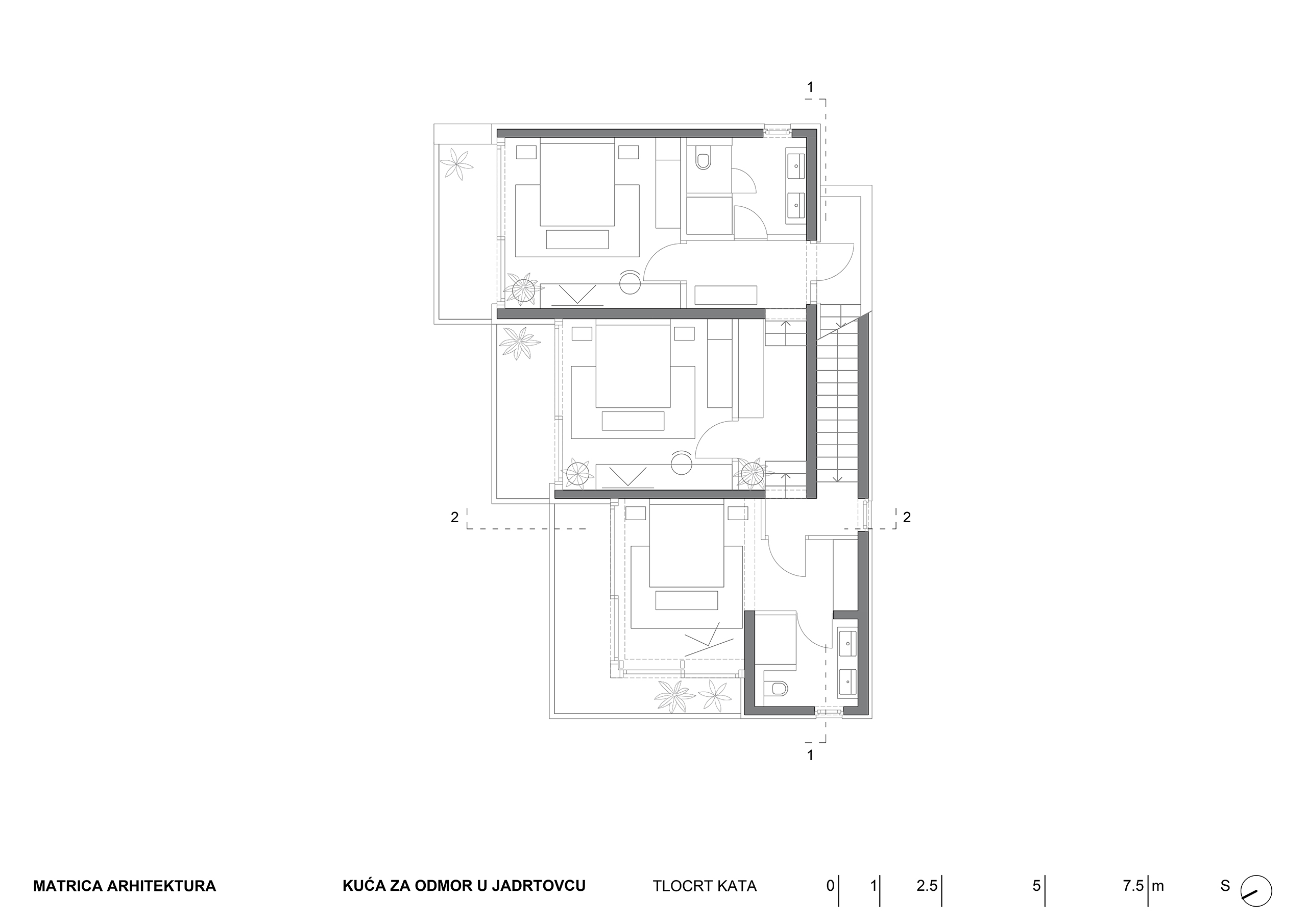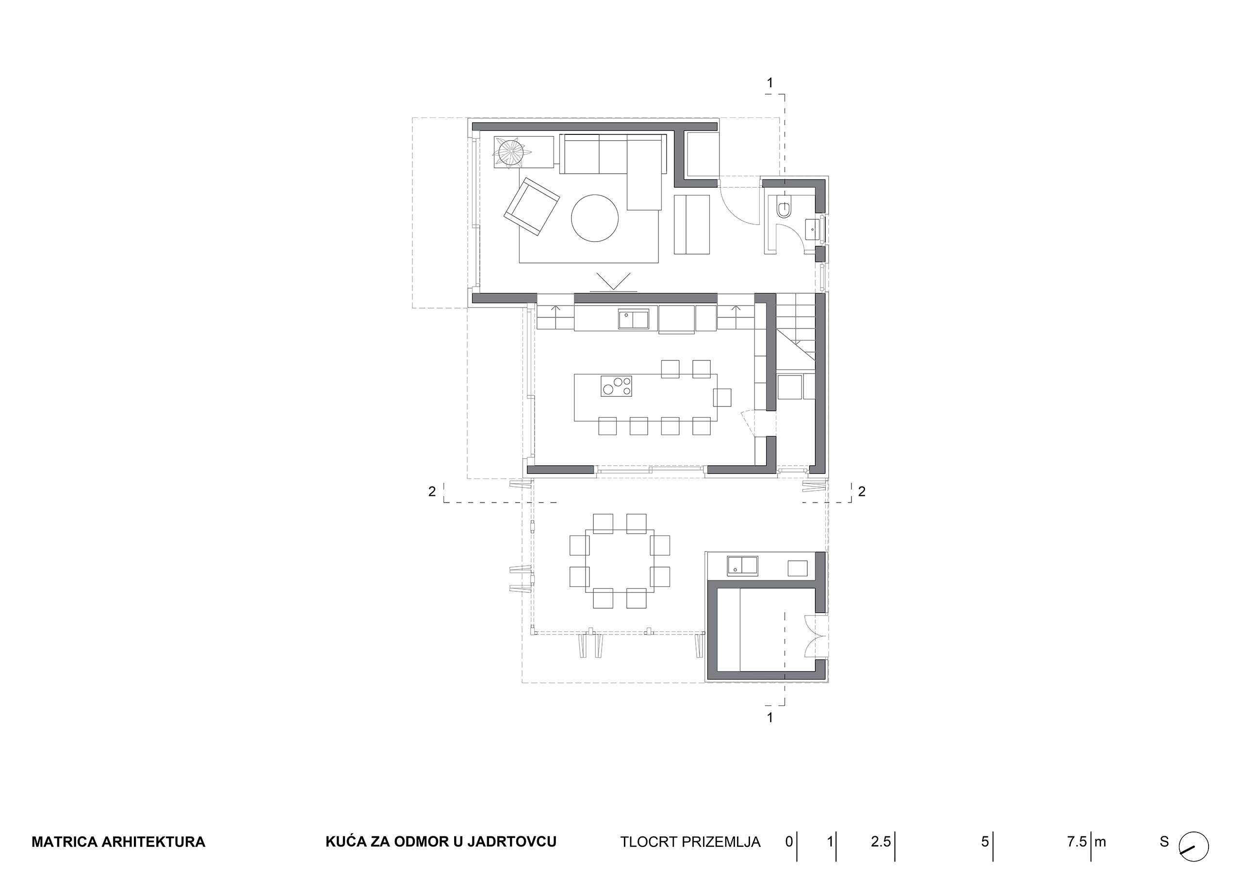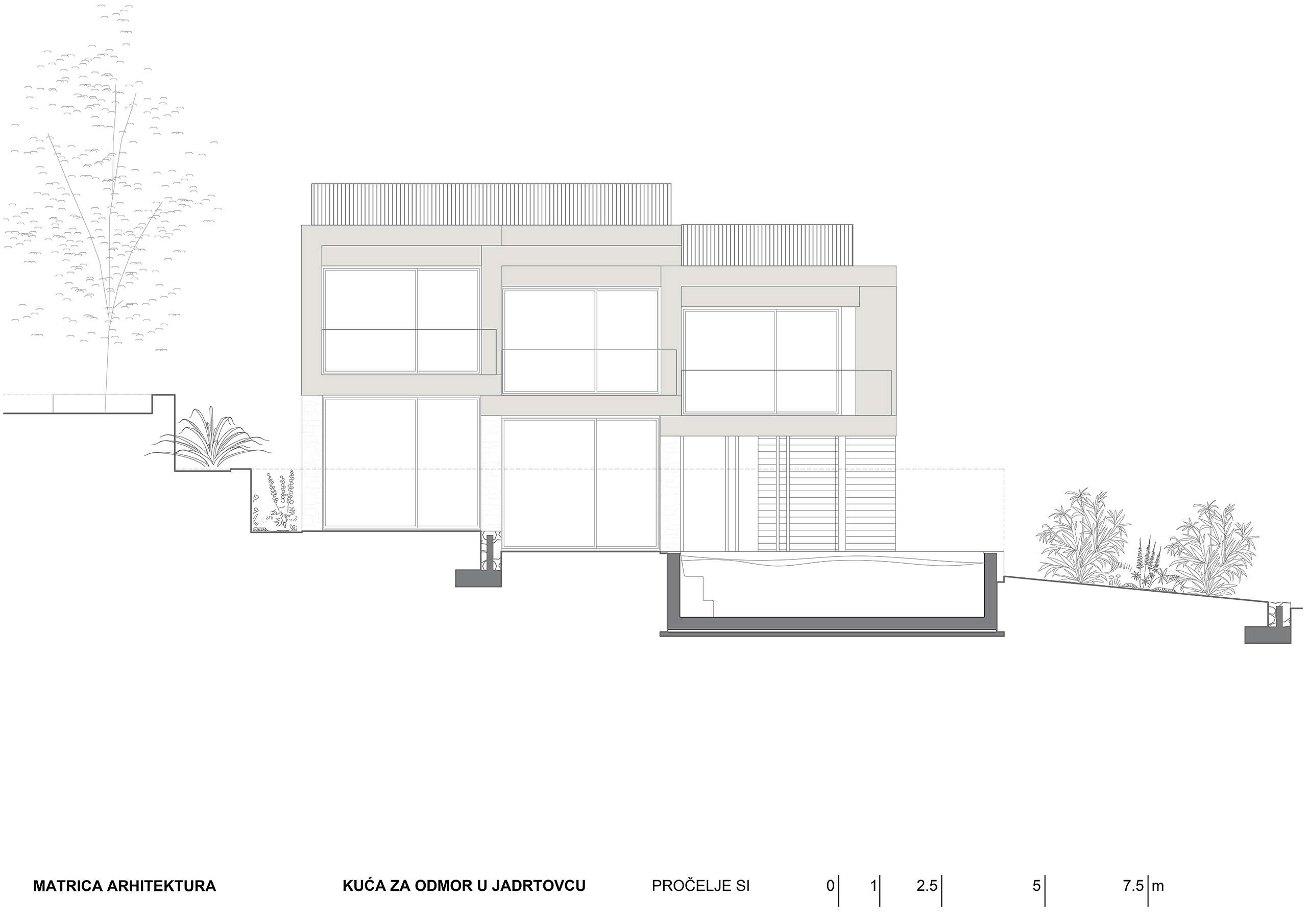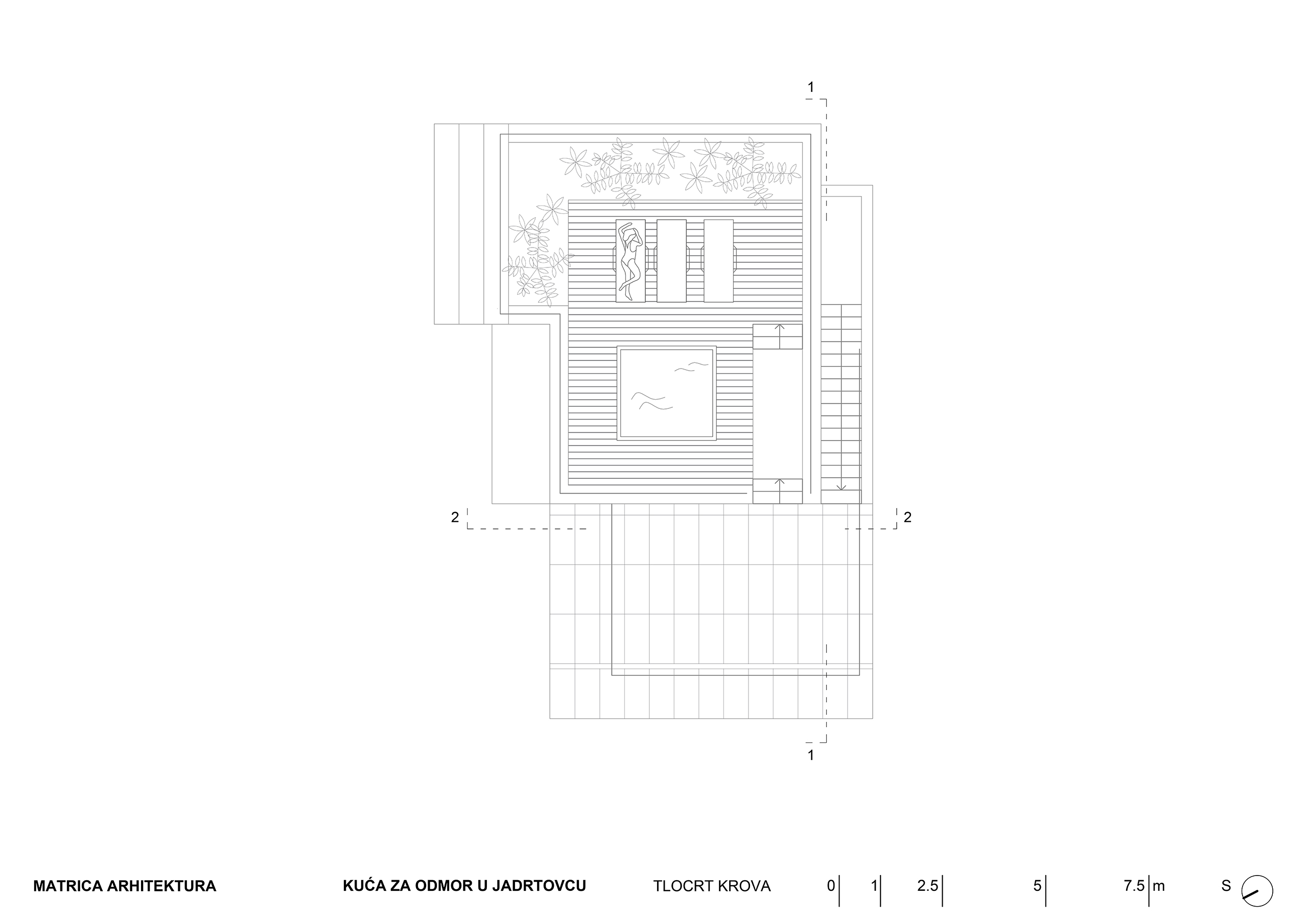 Kuća za odmor u mirnoj uvali Jadrtovca prilagođava se padu terena tako da se iz svakog dijela prizemlja izlazi na terase koje su u razini terena. Osim izmicanja po visini volumen se izmiče i tlocrtno, tako da se svaka prostorna cjelina kuće otvara prema moru a štiti od sunca, što je poželjna karakteristika za kuću koja služi uglavnom za ljetni odmor.