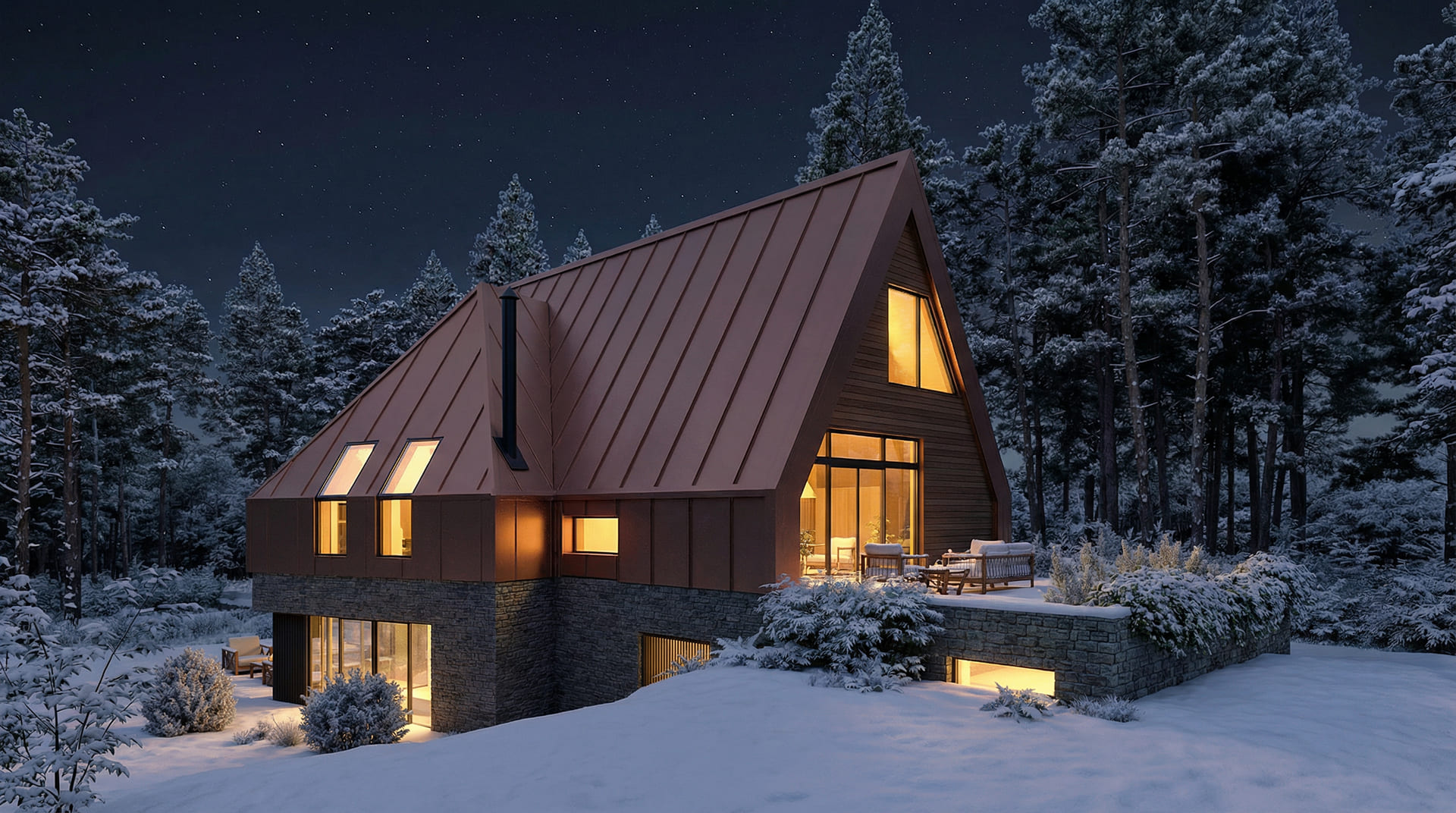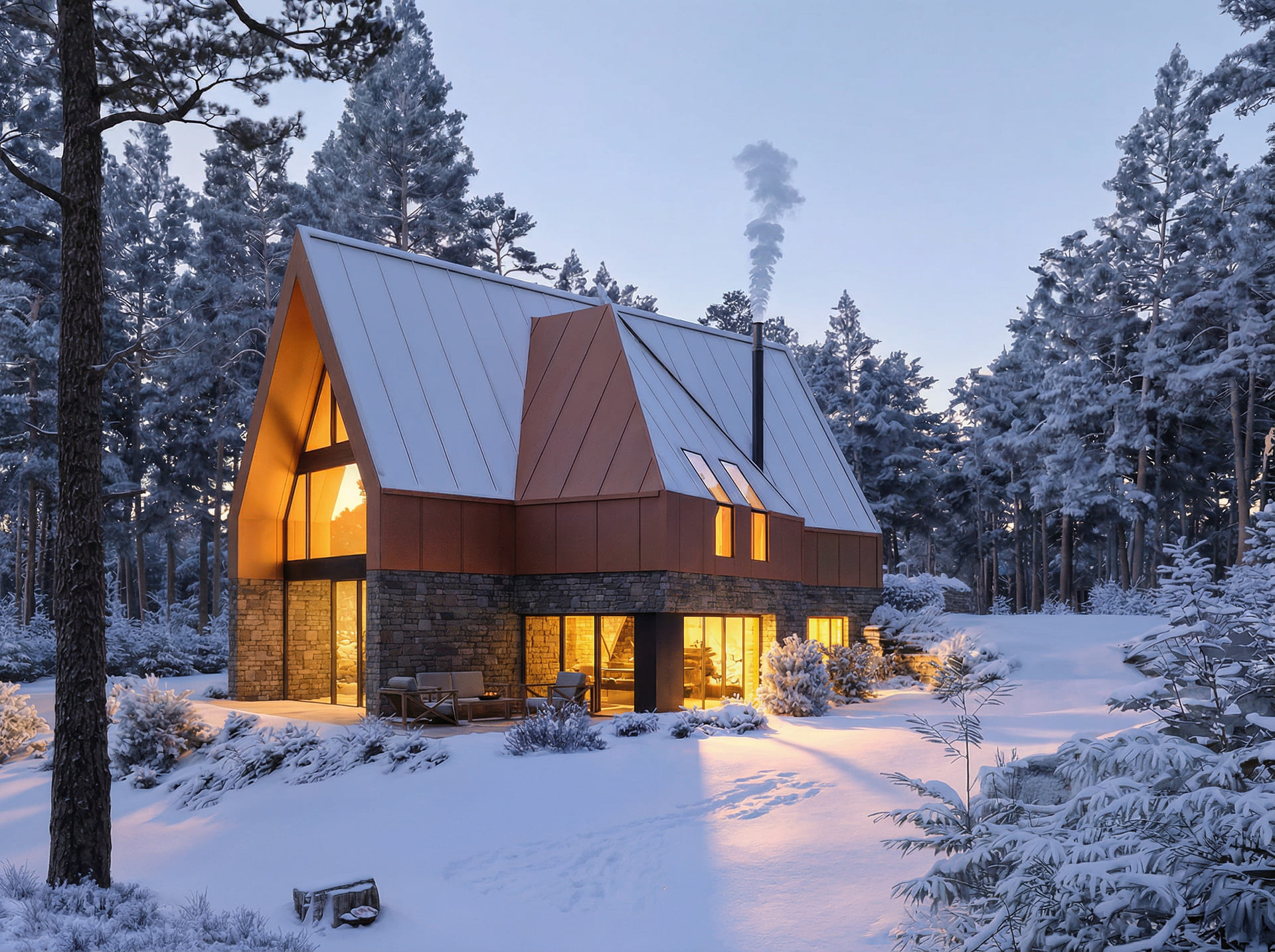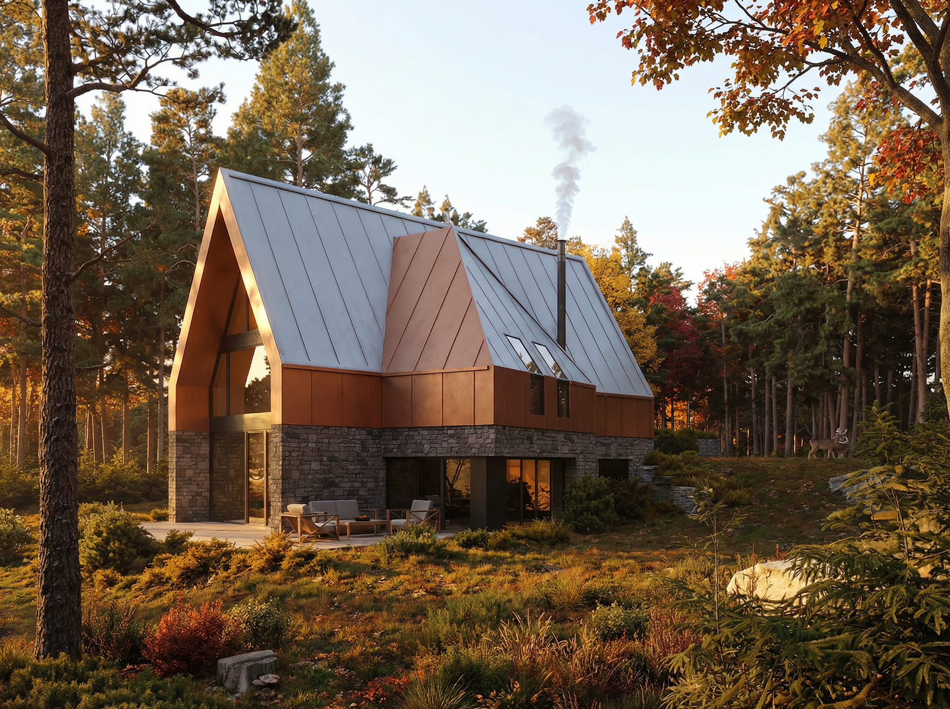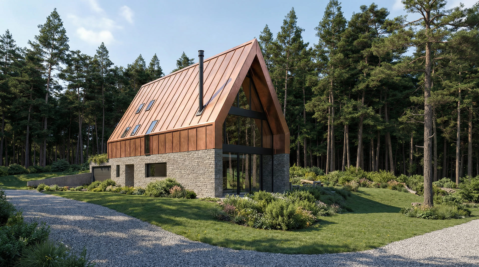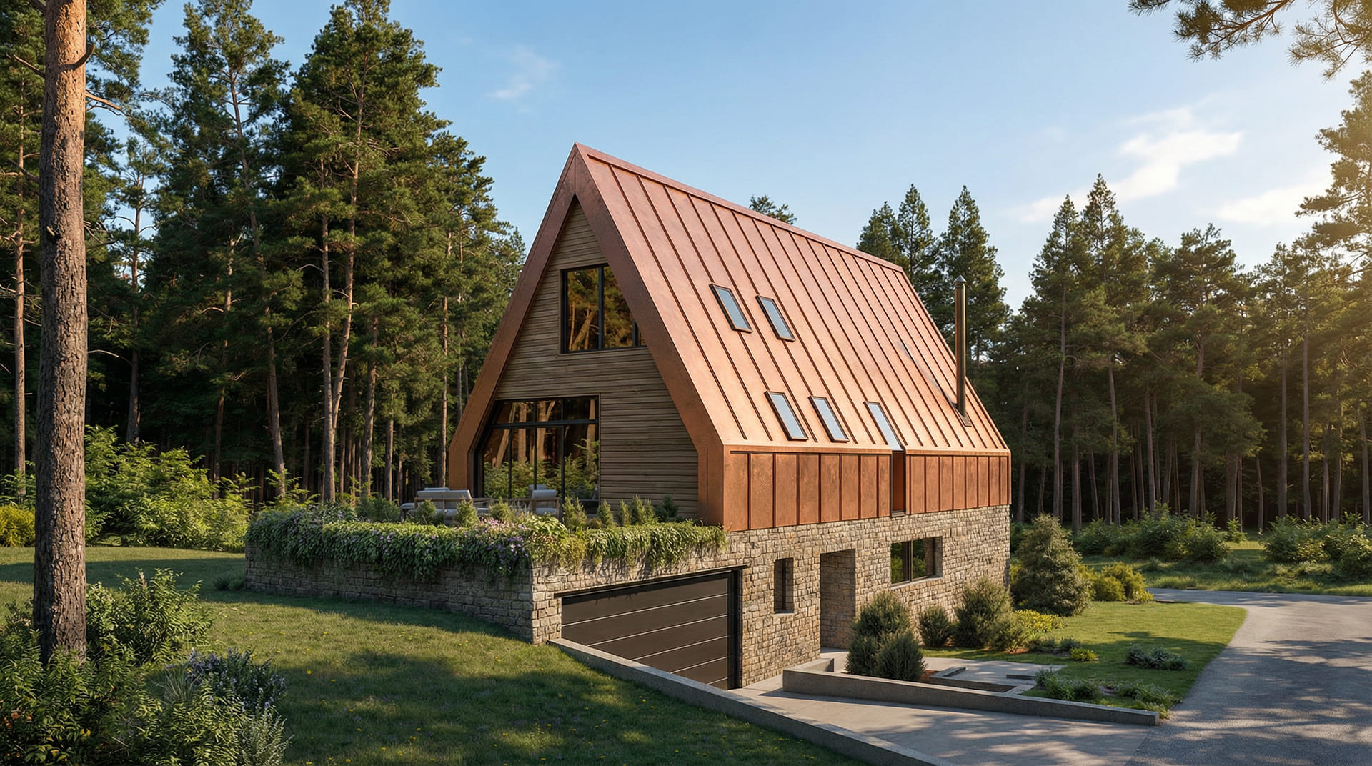 U prizemlju se zid oblaže kamenom, dok je krov od falcanog lima, koji svojom pojavnošću asocira na tradicionalni način oblaganja krova limenim pločama. Na kontaktu s vanjskim prostorima koristi se drvo, kao logičan materijal za kontakt s prirodom koja se iz uređenog dvorišta pretače u visoku borovu šumu.