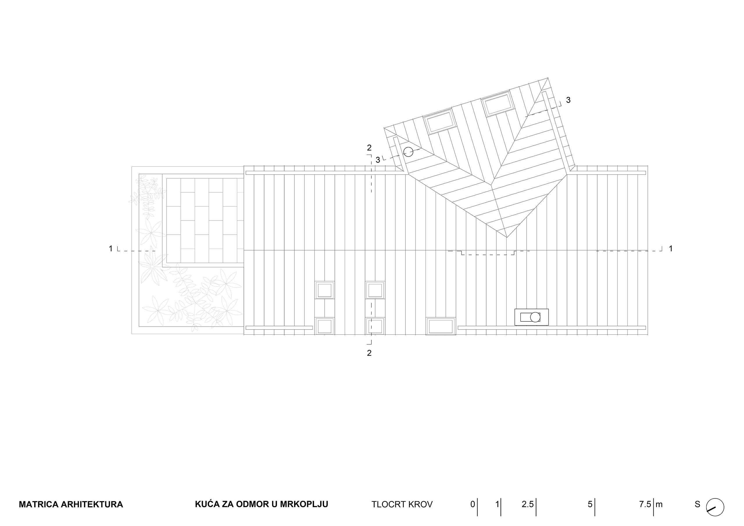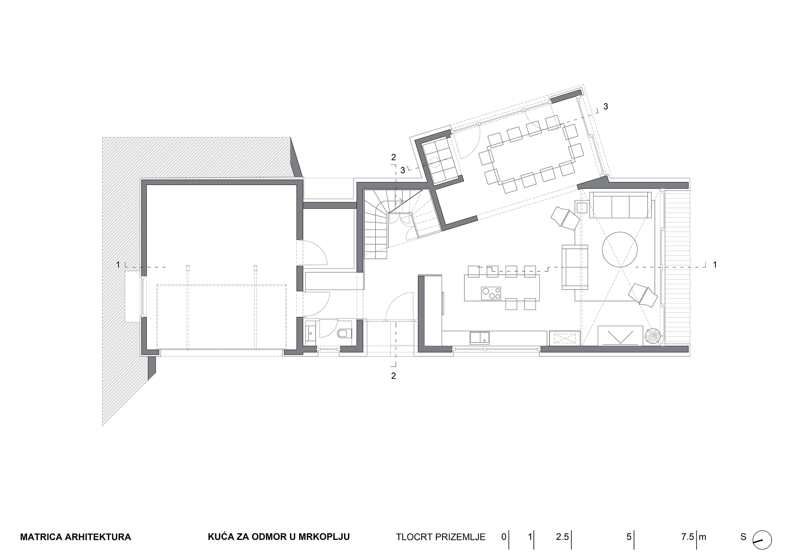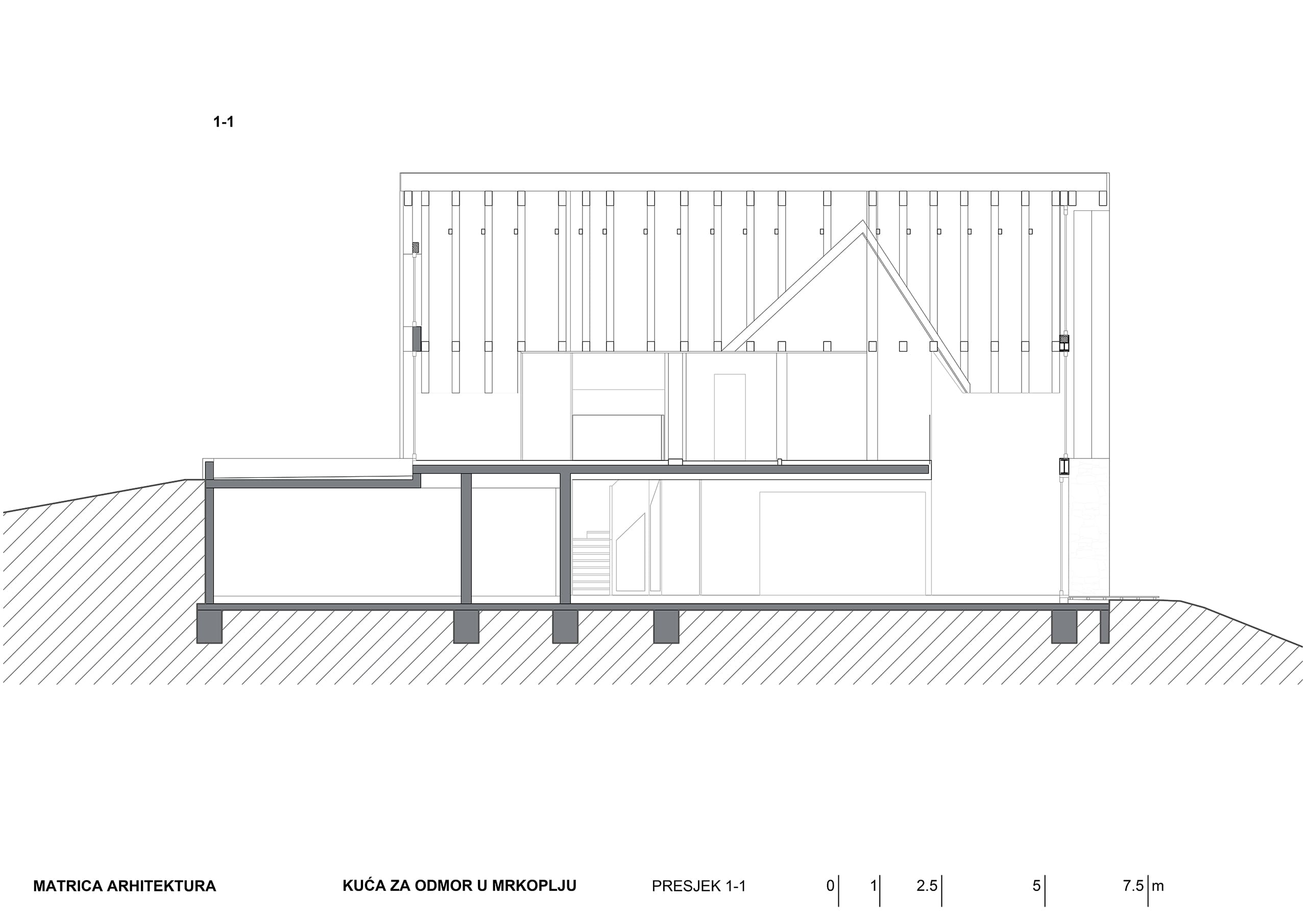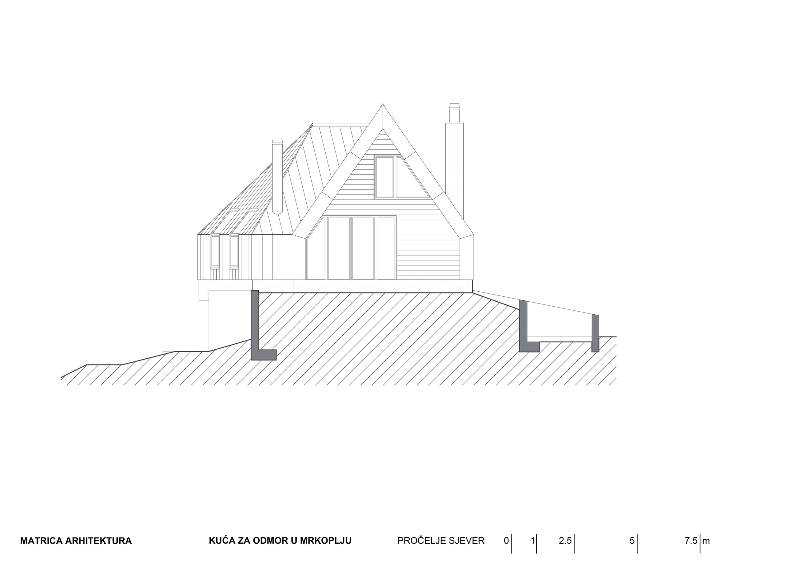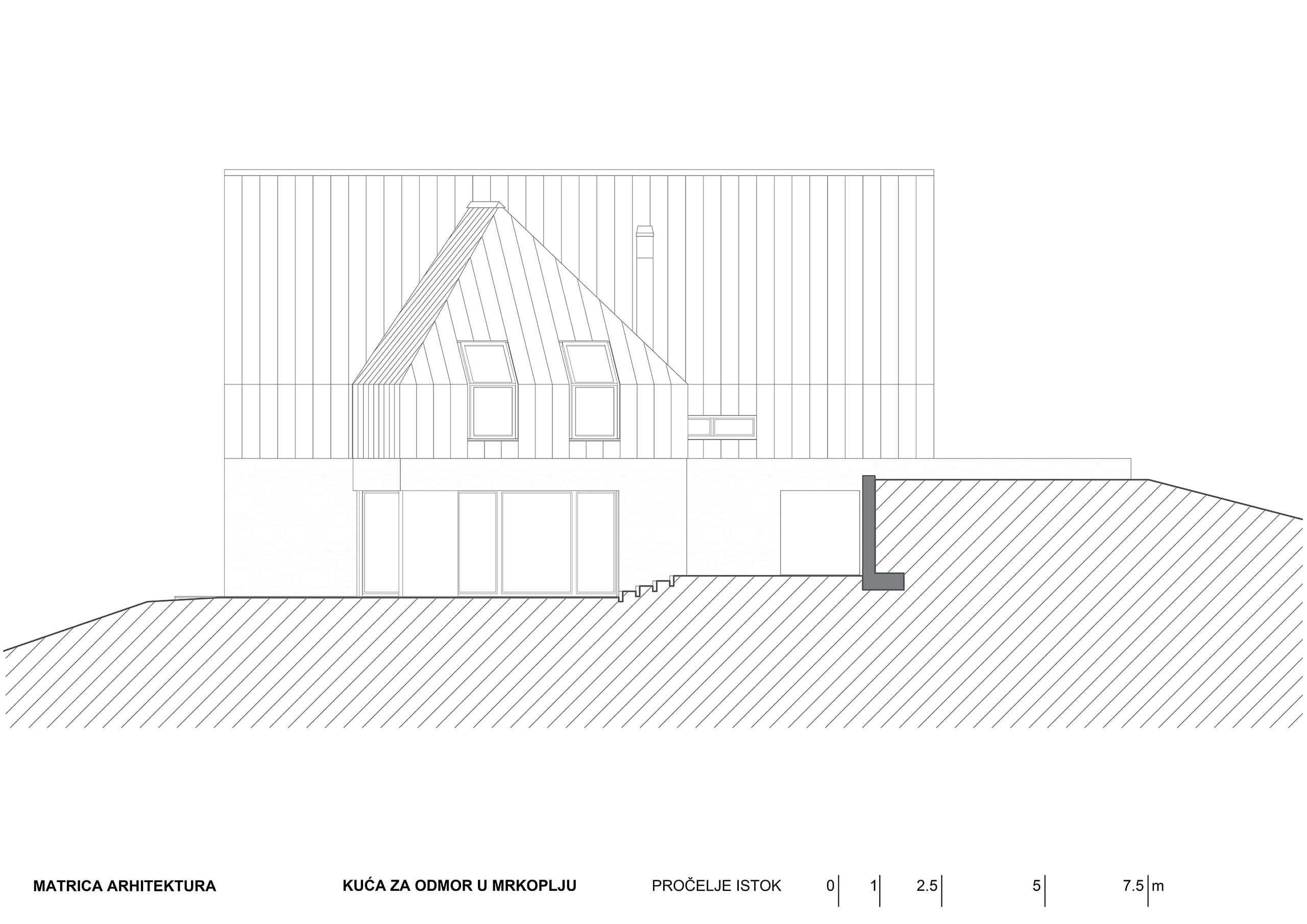 Kuća u Mrkoplju nalazi se na križanju dvije ulice koje nisu pod pravim kutem i njen tlocrt slijedi smjerove obje ulice, i tako se usklađuje s nizom već postojećih susjednih kuća i kuća s druge strane ulice. Svojim strmim krovom kuća ponavlja tradicijske graditeljske obrasce iz neposredne okoline ali oni su interpretirani u suvremenom izričaju.