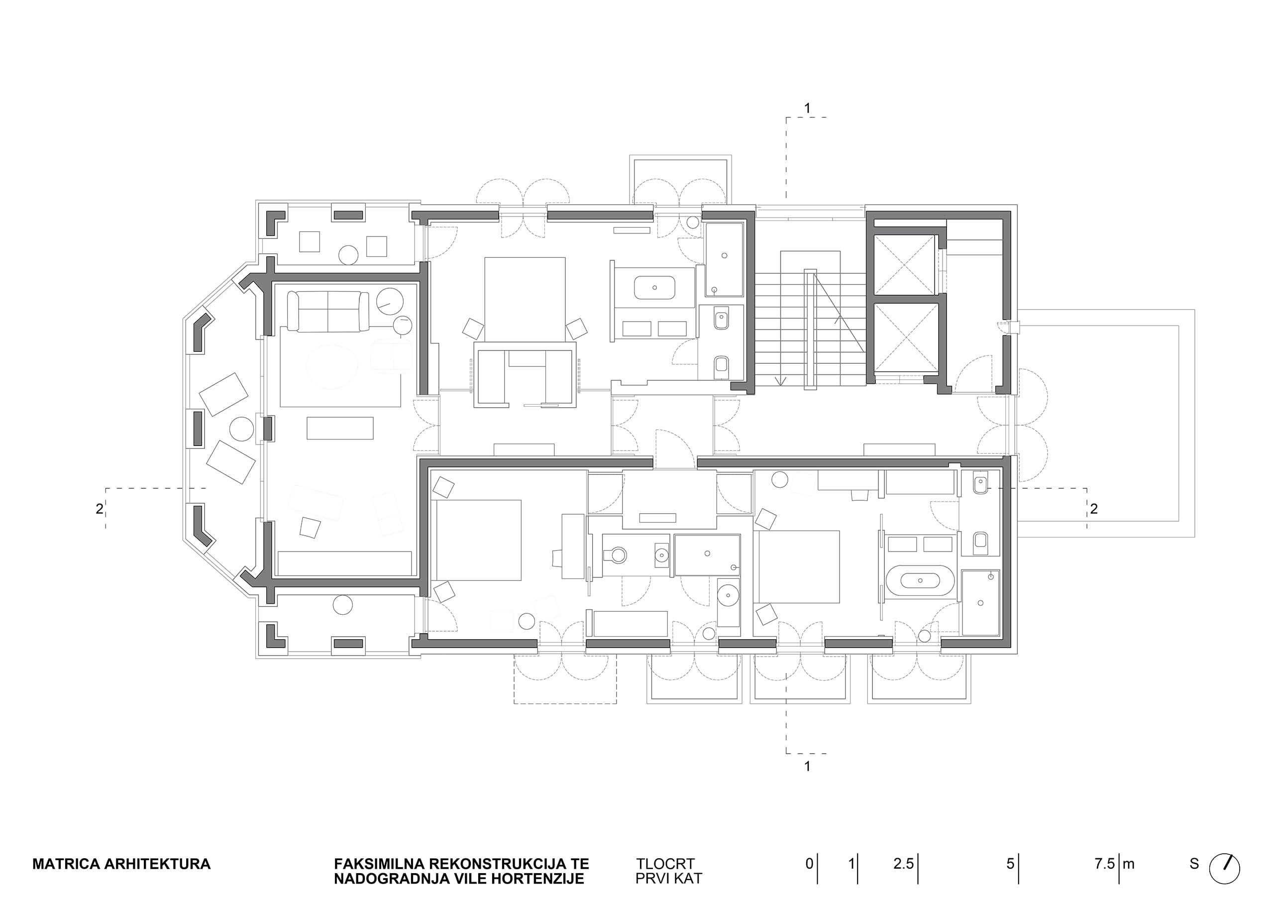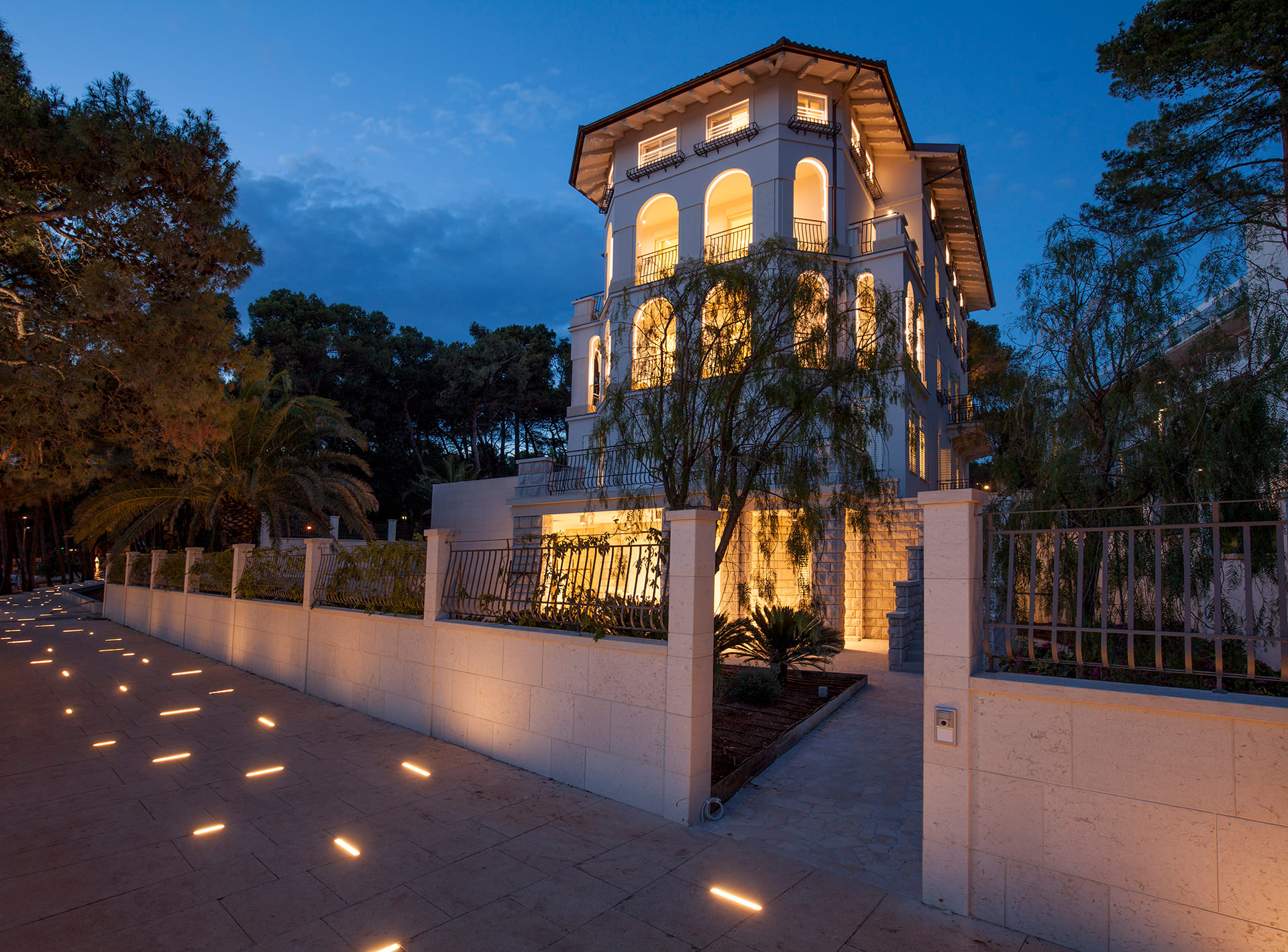 Projekt obuhvaća 1000 m2 vrhunski uređenog interijera i eksterijera. U 7 luksuzno uređenih soba s kupaonicom i terasom s pogledom na more, u lounge prostoru i wellnessu spojeni su povijesni stil s modernim komforom i suvremenim dizajnom. Oko vile se prostire raskošni privatni vrt s potpisom dizajnerice vrtova Nataše Tiške u sklopu kojega se nalazi i bazen s grijanom vodom.